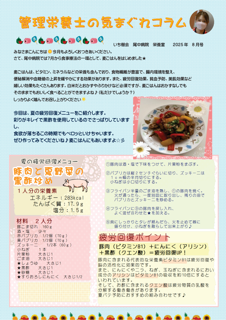 【栄養コラム】麦ごはんと夏の疲労回復メニュー 管理栄養士の気まぐれコラム 2025年8月号をお届けします。 By onaka-hospital | 2025年8月25日 | 栄養コラム | ← クリーンアップ運動を実施しました 【医事課コラム】帯状疱疹ワクチン定期接種のお知らせ →