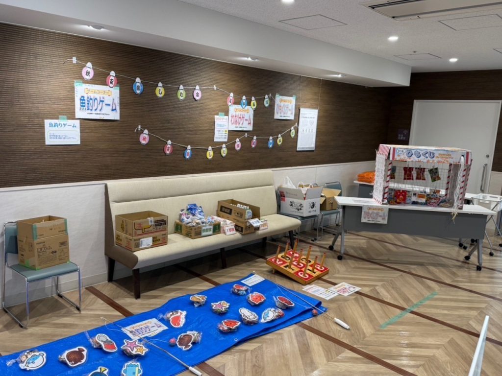 INBODYによる身体チェックやリハビリスタッフの筋力訓練体験、輪投げや魚釣り、くじなどのゲームコーナーやキッチンカーの出店などもありました。