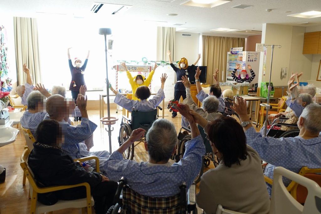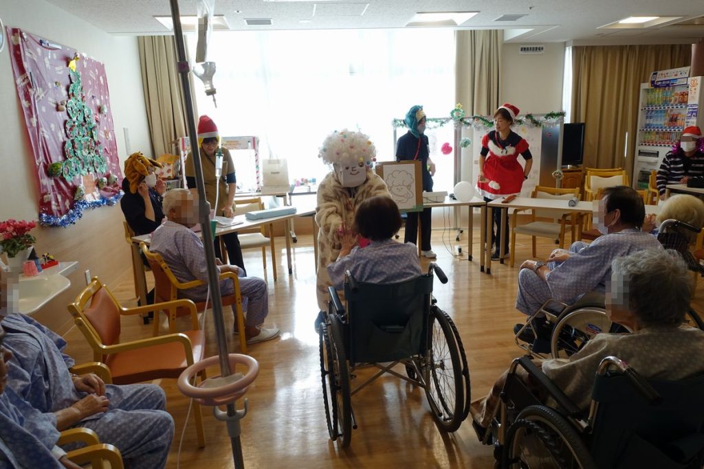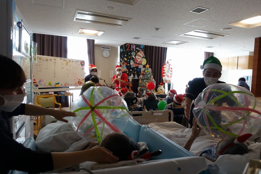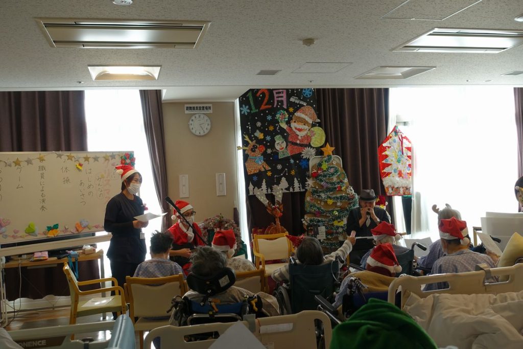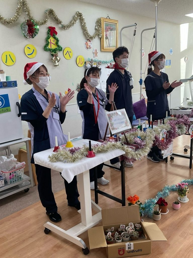 いつもは自室で過ごされる患者さんも積極的に参加され、「いい気分転換になった」と話されていました。ベッドで寝たきりの患者さんもベッドごとデイルームに出てクリスマス会の雰囲気を味わっておられました。