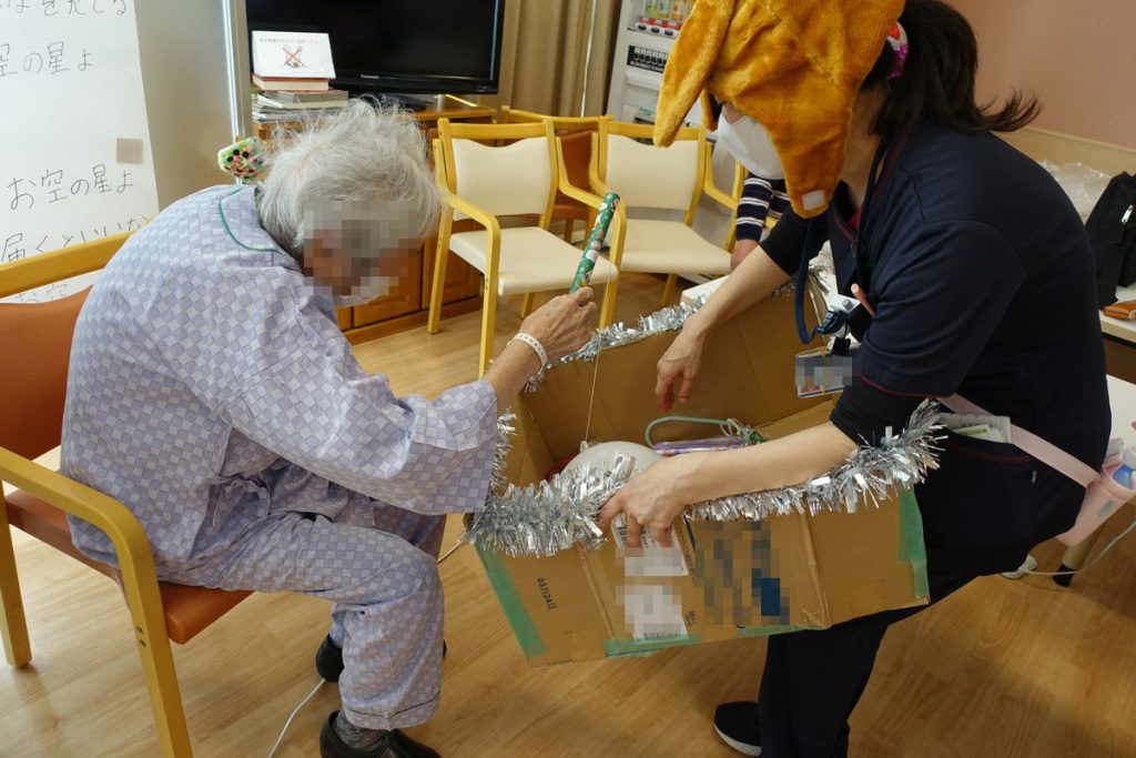 ピアノ上手な患者さんによる演奏や病棟スタッフによるきらきら星の演奏などでクリスマス会がスタートしました。スタッフお手製の輪投げや釣りゲーム、おみくじなどを皆さん楽しんで参加されていました。