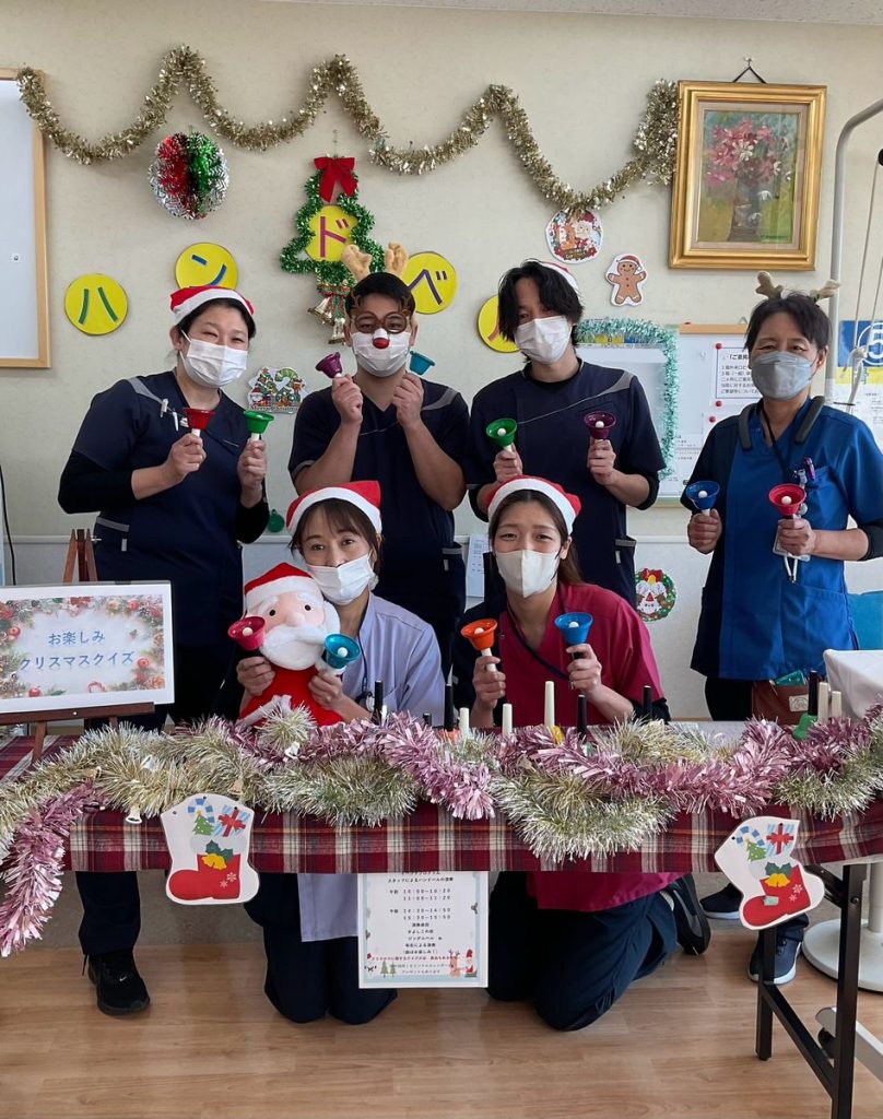 今年はスタッフでハンドベルの演奏とクリスマスに関連したクイズの出題を行いました。披露した曲は「ジングルベル、きよしこの夜、ふるさと、きらきら星、上を向いて歩こう」です。スタッフのほとんどがハンドベル初心者でしたが、みんなでコツコツと練習を重ね、皆さんに楽しんでいただくことができました。