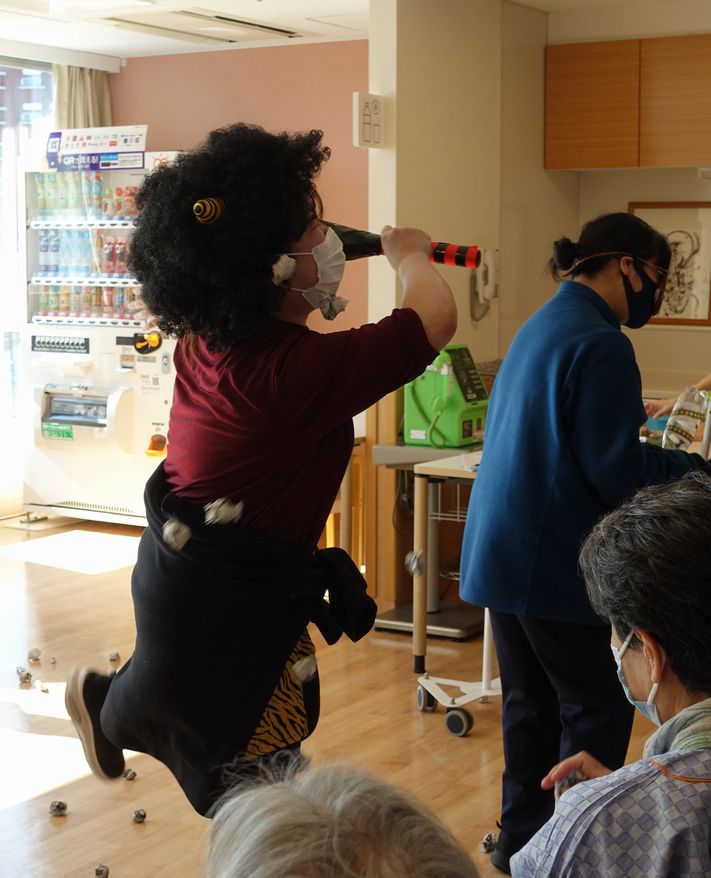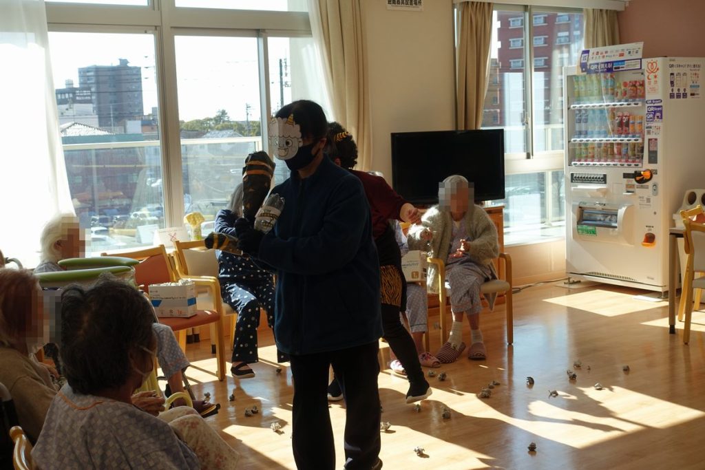 そして午後からラジオ体操で準備運動を行った後、患者さんと作った豆を使って「鬼は外、福は内」の掛け声と共に豆まきを行いました。